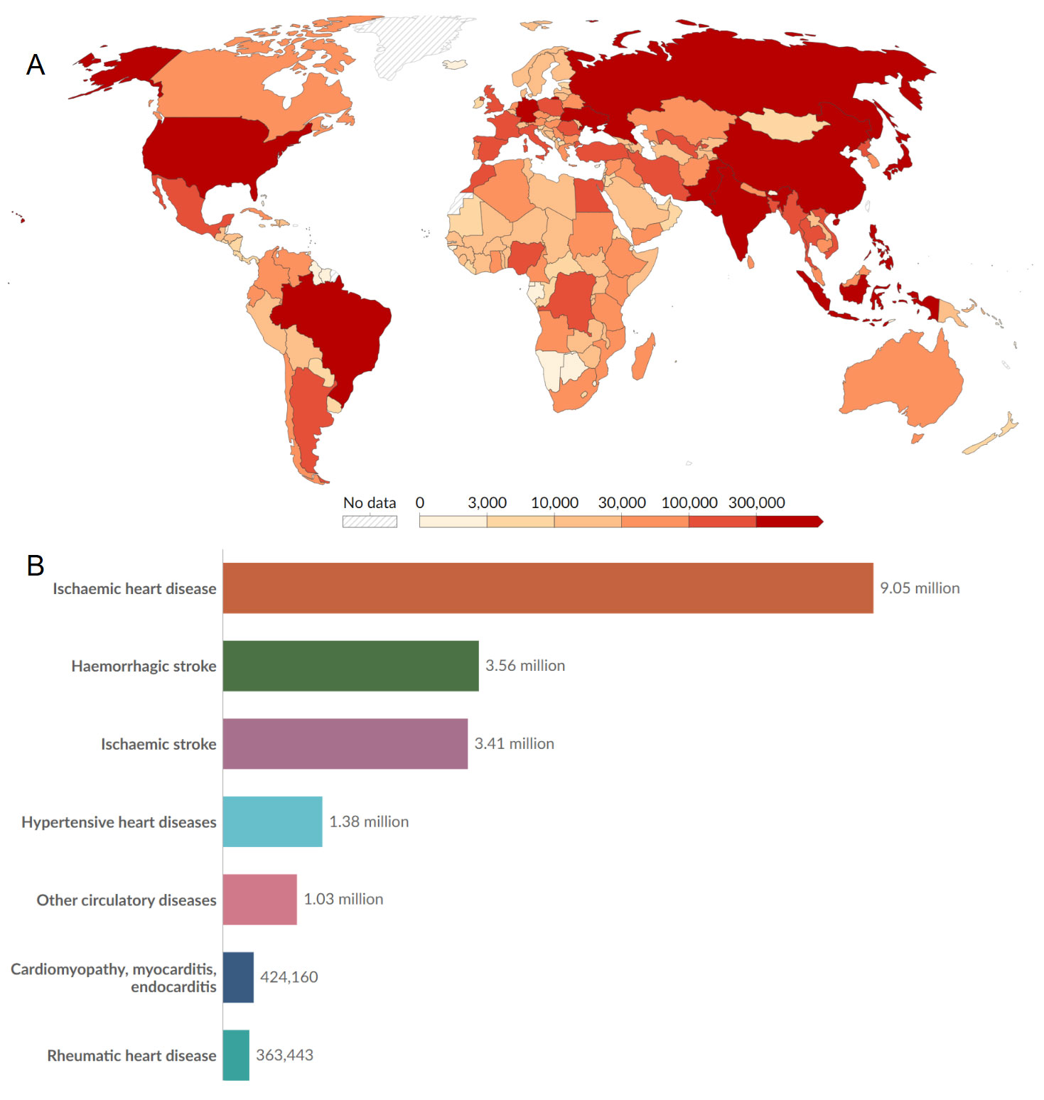 Figure 2. Deaths caused by cardiovascular diseases, 2021 (A) and number of deaths from cardiovascular diseases by type, 2021 (B). Sourced from World Health Organization (2024) – with major processing by Our World in Data.