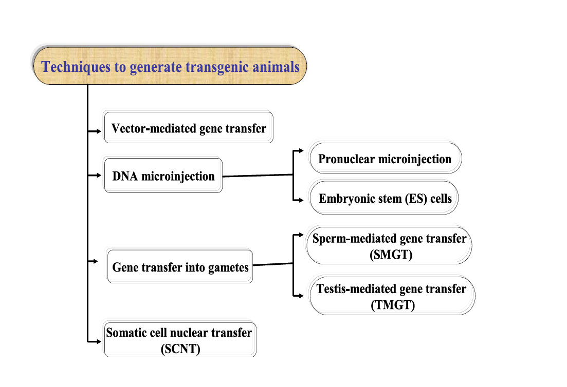 Genetic engineering focuses on the targeted modification of an organism’s traits by directly altering its DNA. Using recombinant DNA technology, scientists can transfer genes across species boundaries, introducing new characteristics into plants, bacteria, viruses, or animals that would otherwise be impossible through natural breeding. One of the earliest applications of this technology was the creation of transgenic organisms, where genes from unrelated species are introduced to achieve specific outcomes. The primary approaches used to create transgenic animals are illustrated in Figure 1. Historically, the first genetically modified organism was created in the 1970s when scientists introduced foreign genes into the bacterium Escherichia coli. By 1985, this technology extended to farm animals, opening new avenues for improving agriculture. Transgenic modifications in farm animals offer several advantages, including improved feed efficiency and growth rate, better carcass composition, enhanced milk production and composition, and increased resistance to diseases (e.g., resistance to BSE in cows). Beyond food production, genetic engineering is also applied in medicine and biotechnology. For instance, genetically modified animals can produce human-compatible organs for transplantation (xenotransplantation) or serve as models for studying diseases and testing new treatments. A particularly interesting innovation is BioSteel silk, a highly strong, flexible, and lightweight fiber with diverse applications, including medical materials, the textile industry, and ballistic equipment. This remarkable material was created by inserting spider genes into goats, enabling them to produce silk proteins in their milk.