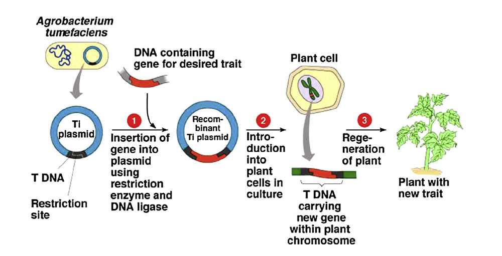 In 1983, the first genetically modified plant, a tobacco plant with antibiotic resistance, was developed. This was achieved using a new method introduced in the 1980s that utilized the pathogenic bacterium Agrobacterium tumefaciens to transfer genes into plants (Figure 2). Many agronomically important plant species, such as tobacco, corn, tomato, potato, banana, alfalfa, and canola, have since been used to express various recombinant proteins. Genetically engineered plants provide considerable advantages by increasing production yield, enhancing nutritional content, and creating resistance to insects, pests, viruses, and specific herbicides. Beyond agricultural use, genetically modified plants now play an important role in medicine, producing antibodies, therapeutic proteins, and vaccines.