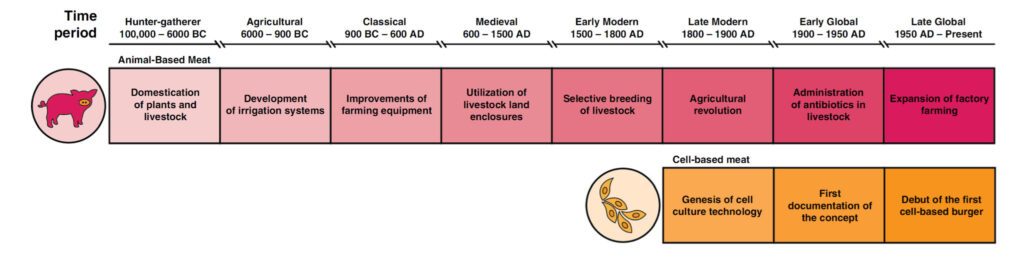 Figure 1. The history and evolution of animal based and cell based meat. Sourced from Rubio et al. 2020 with modifications.