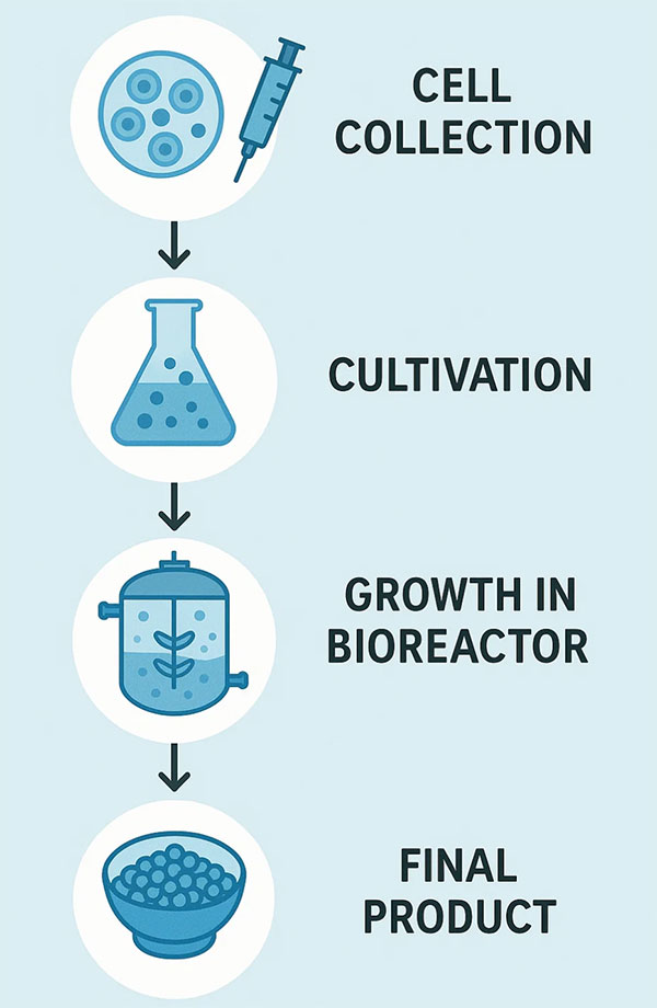 What exactly is cultivated meat? Cultivated meat offers a new approach to producing animal protein, based on growing cells directly rather than through conventional animal farming. Unlike plant-based meat alternatives, which rely on soy, peas, or other plant proteins to mimic the taste and texture of meat, cultivated meat is an authentic animal product. The process (see Figure 1.) starts with a few animal cells of different sources (e.g. beef, pork, chicken, fish, seafood), which are placed in a specially designed nutrient-rich medium that encourages them to divide. Cultivated meat is produced in a highly controlled environment, allowing for strict safety and quality standards. Each stage of production is monitored to ensure that the final product is safe to eat. Since cultivated meat is grown in a sterile environment, it is not exposed to viruses, bacteria, or parasites. This ensures that it is pure and free from contaminants. Moreover, it may reduce the need for certain inputs, such as antibiotics, which are otherwise used in some forms of livestock farming. This minimizes the risk of antibiotic-resistant bacteria.